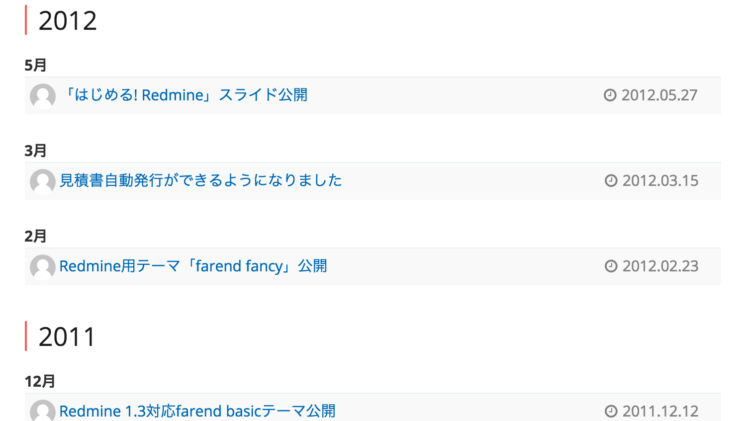 前田です。少し前にこのサイトの ブログ記事一覧ページ で担当者のアイコンが表示されるようにしました。どれが自分の記事がすぐわかるようになり、私は昨年10月以降ほぼRedmineのことしか書いていないことが判明しました。