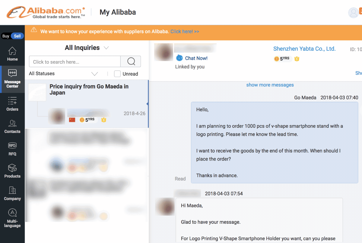 Alibaba経由で問い合わせるとすぐに担当者から返信がありました。ロゴを入れる場合の単価と最低発注数、ロゴの印刷可能サイズ等を確認し、十分納得できる条件でした。