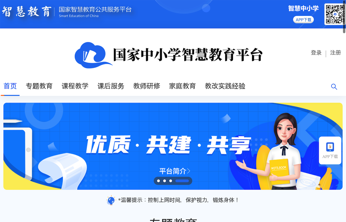 実は国家中小学智慧教育平台は「智慧教育」(Smart Education of China)というWebサイトの構成要素の一つです。智慧教育には国家中小学智慧教育平台のほか、国家职业教育智慧教育平台(職業教育)、国家高等教育智慧教育平台(大学レベルの教育)も含まれます。