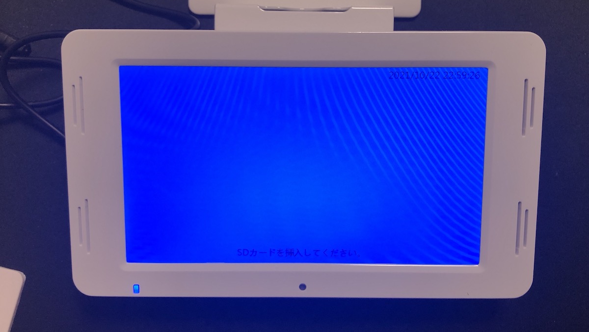 電源を入れると、SDカードを挿入してくださいと表示されます。SDカードは別売りなので自分で用意する必要があります。