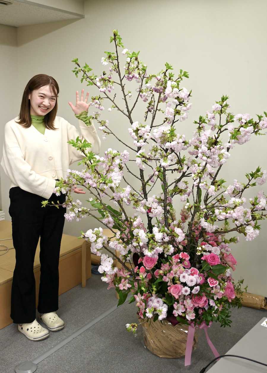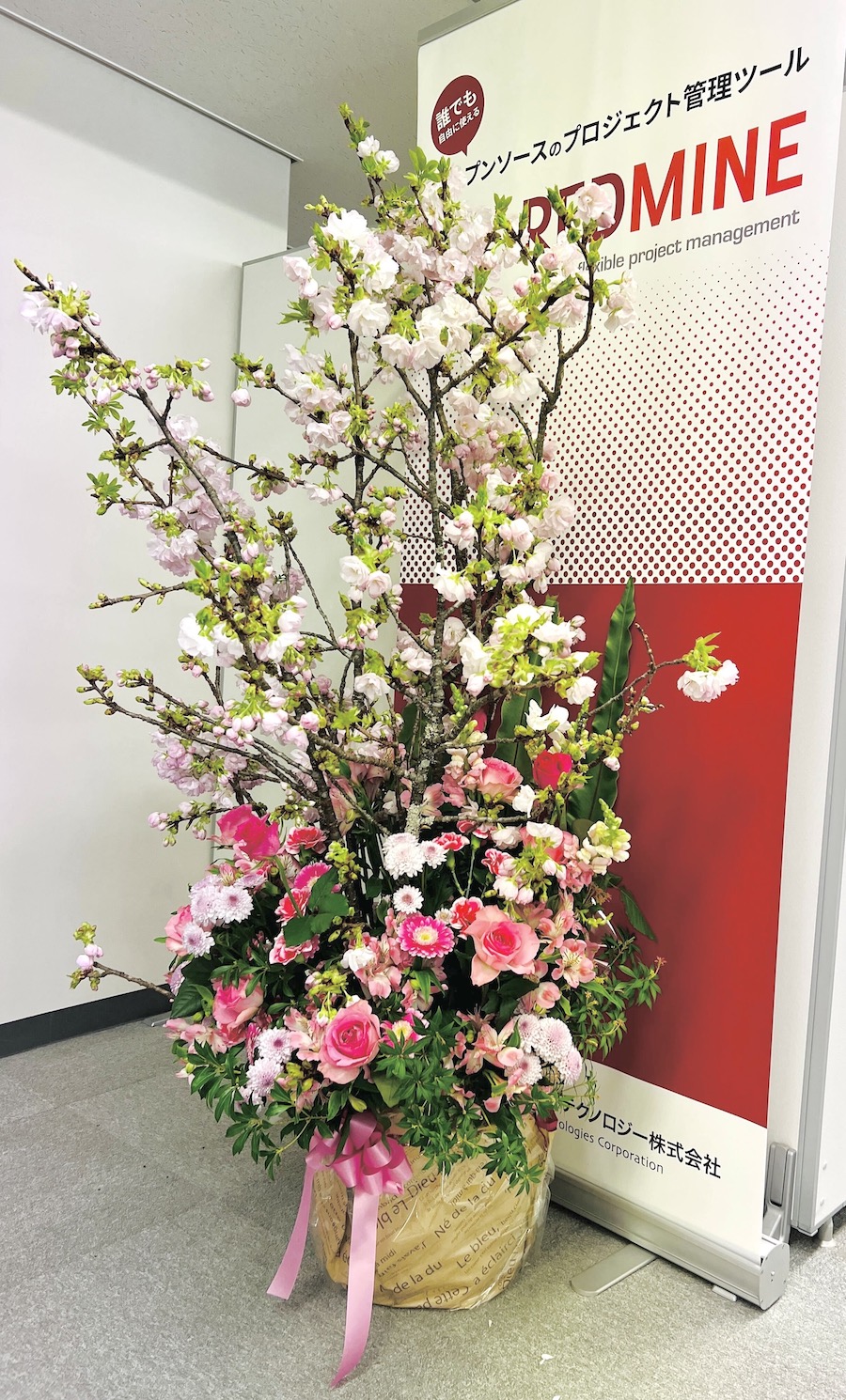 お花見用にフラワーアレンジメントを依頼するというお話を耳にしたとき、私は手のひらで持てる程度の小さいお花をいくつか飾ることをイメージしていました。ところが、届いたお花は想像を絶する大きさでとても驚きました。私よりも大きいのです。このお花の大きさは社内でもかなり話題になりました。