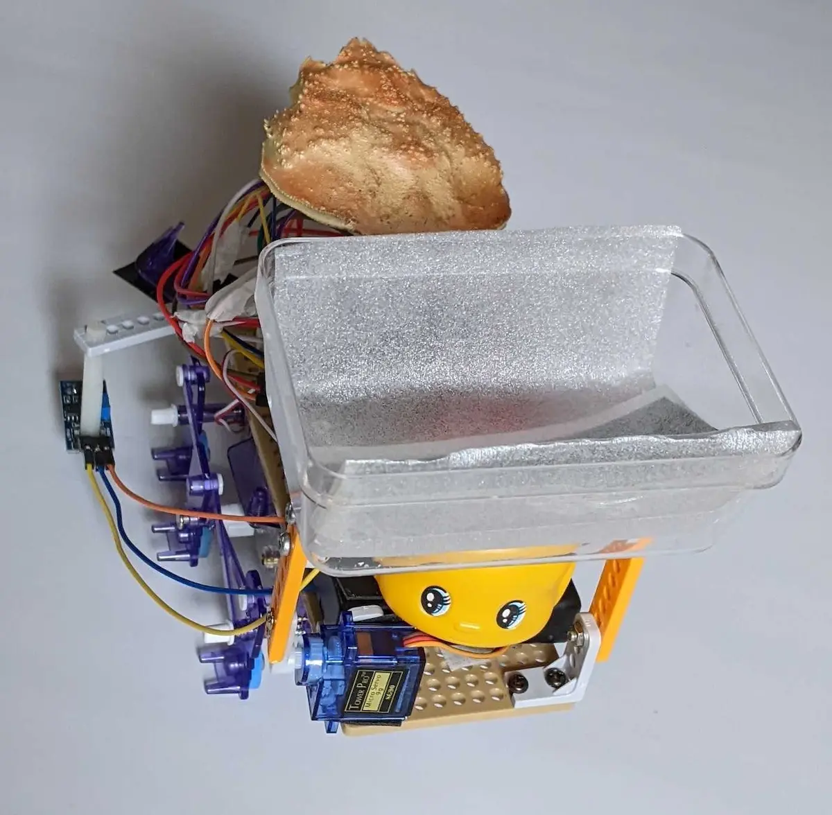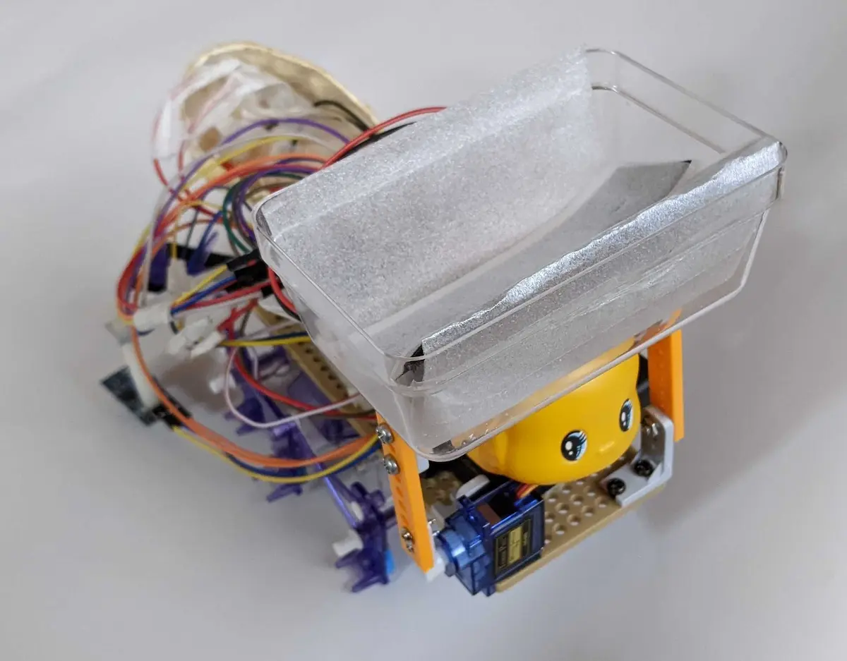 サーボモーターの使途は所定の位置までボールを運ぶことです。 サーボモーターにユニバーサルアームと箱を取り付け、ボールを入れ、アームを倒すことでボールを落とす、という機構を作成しました。