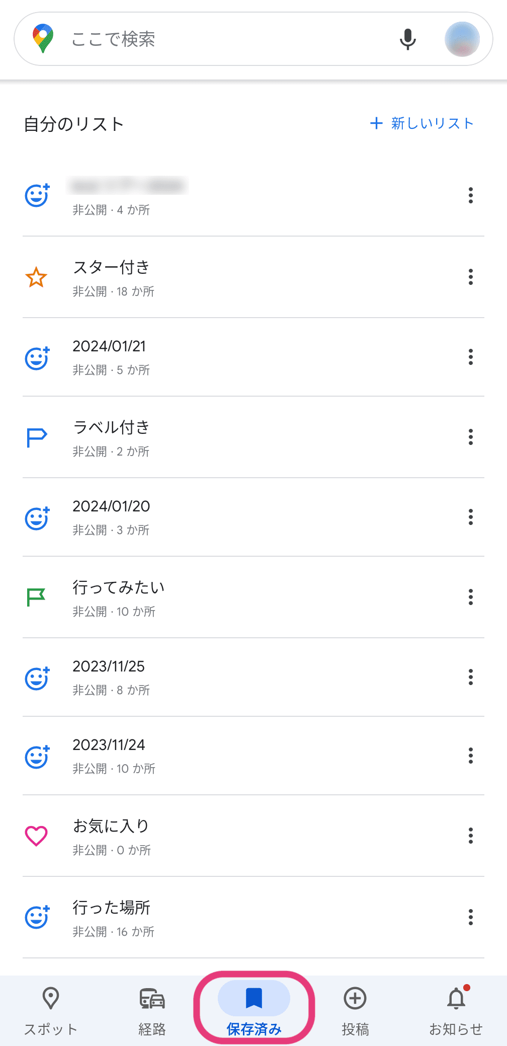 作成したリストは下のメニューにある「保存済み」から確認できます。