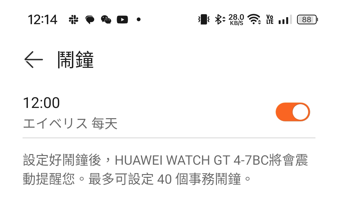 私は医師に処方された目薬を毎日1回ささないといけないのですが、たまに忘れてしまうことがあります。さし忘れを防ぐためにHUAWEI WATCHのアラームを毎日正午に鳴るようにセットしました。