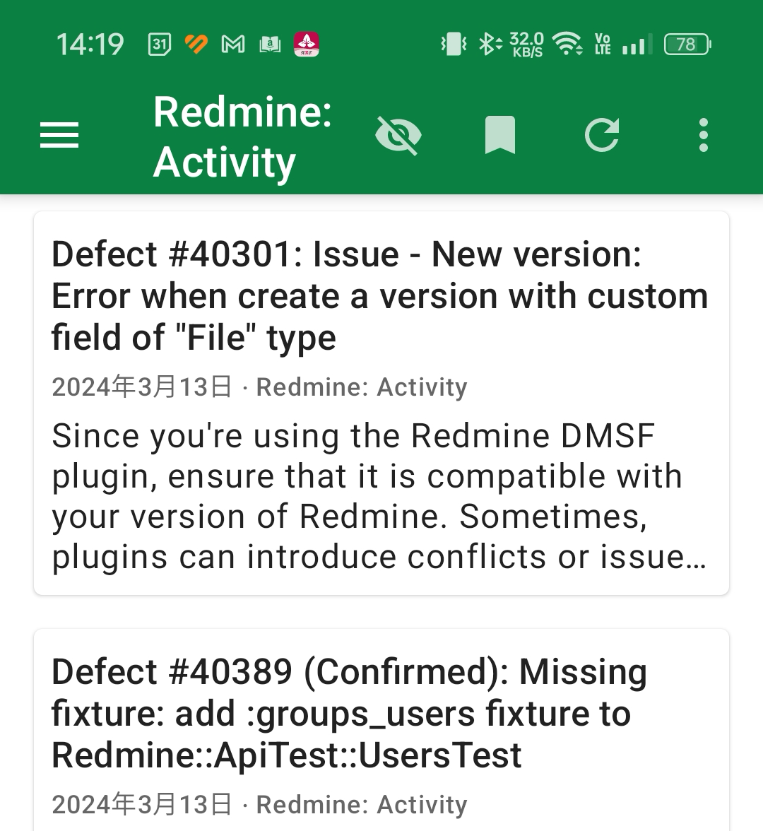 私はオープンソースのプロジェクト管理ツール「Redmine」の開発に協力しているので、Redmine公式サイトのチケットの作成・更新状況を気にすることが多いです。そこで、スマートフォンにフィードリーダーアプリ「Feeder」をインストールしてRedmine公式サイトの活動画面のAtomフィードを登録し、その通知をHUAWEI WATCHに送るようにしました。