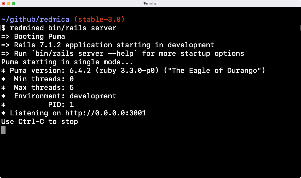 RedMicaのディレクトリ内でredmined bin/rails serverを実行すると、redmined-container-redmica (redmined-container-<name>)コンテナが起動し、redmined-bundle-cache-redmica (redmined-bundle-cache-<name>)ボリュームにgemが保存されます。また、お察しの通り、RedMicaは3001ポートで実行されます。