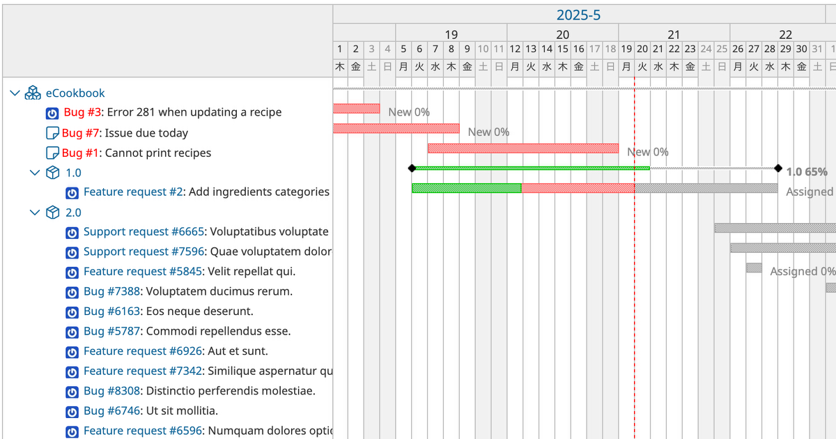 前田です。今年のゴールデンウィークに取り組んだことの一つはRedmineのガントチャートの表示速度改善です。ガントチャートは数千件のチケットを表示しようとするとサーバ側の処理で数秒かかることがあります。デフォルト設定では500件以上のチケットはガントチャートに表示されないので著しく遅くなることはありませんが、Redmineの「管理」→「設定」→「チケットトラッキング」画面の設定「ガントチャート最大表示件数」を大きな値に変更するとこの問題が顕在化します。