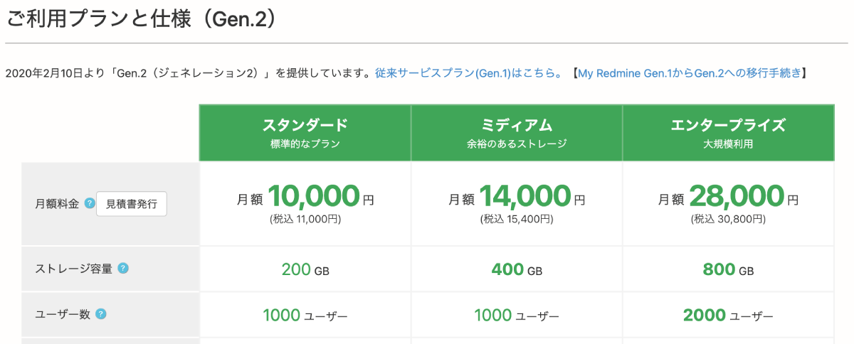 弊社サービスMy Redmine JP Edition(Gen.2)はご利用プランによりご利用可能なストレージ容量が決まっています。