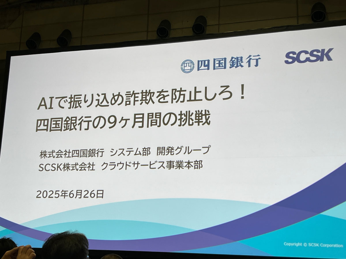 四国銀行様が不正送金詐欺対策のソリューションを内製されたお話でした。ATMの操作をプライバシーなどに配慮しながら撮影し、不審と判断される対象をAIを使って絞り込み、振り込め詐欺抑制の働きかけを行うという内容でした。