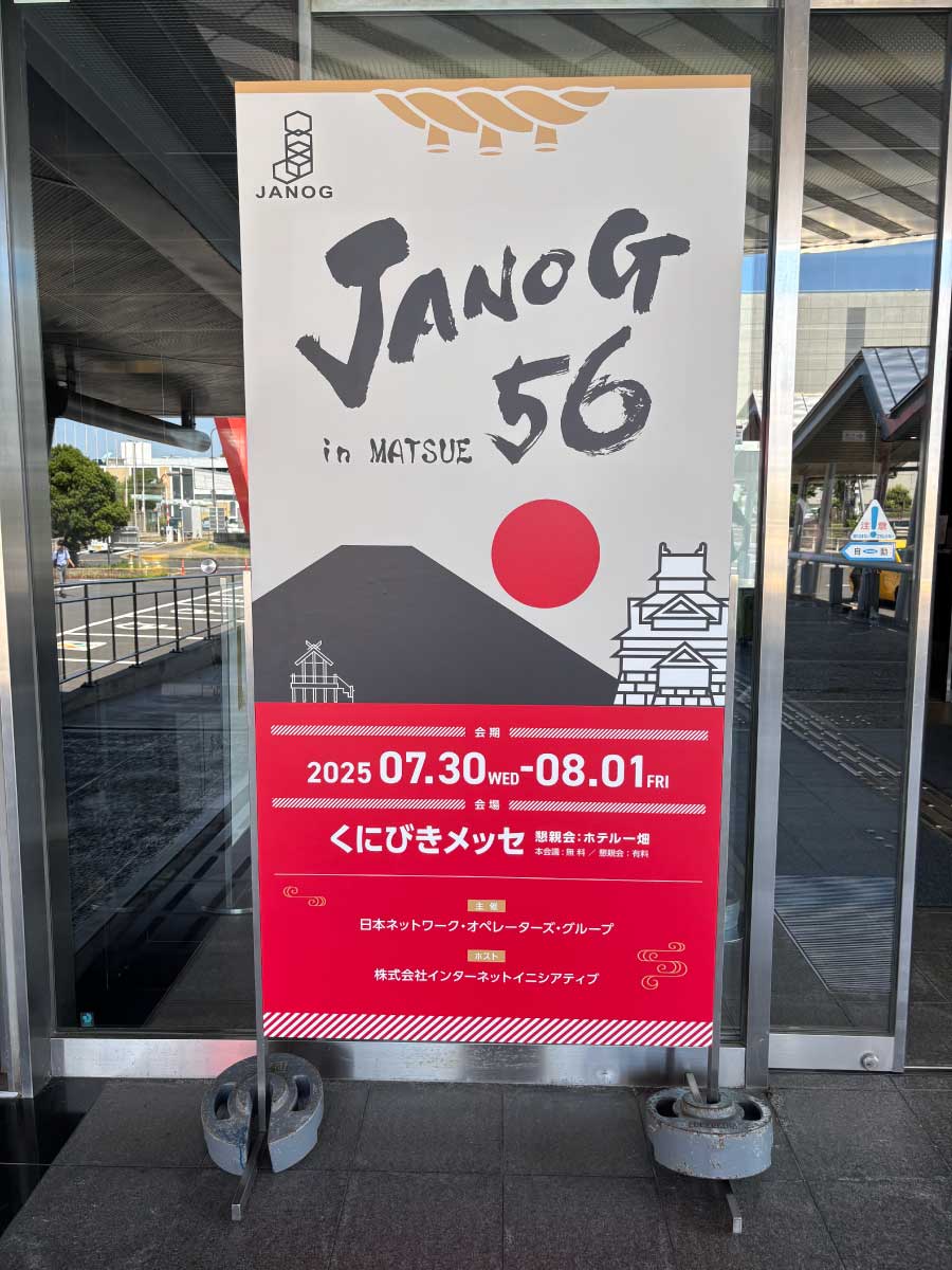 今回のブログ担当は石川です。2025年7月30日~8月1日に島根県松江市のくにびきメッセで開催された「JANOG56 Meeting」に初めて参加してきました!初参加で、ネットワーク分野に詳しくない私の視点から見たJANOGについての感想を書いていきます。