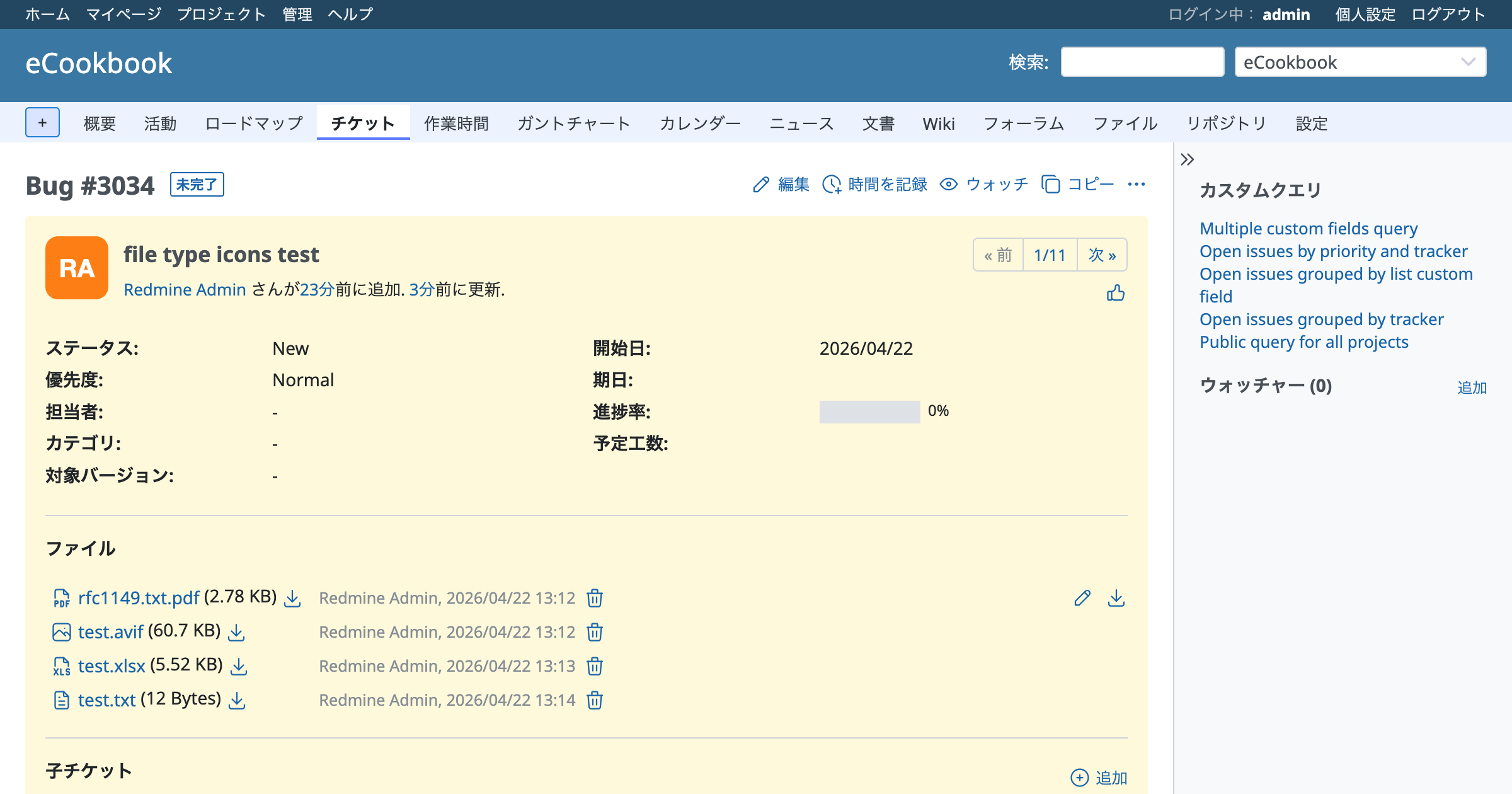 チケットやWikiなどに表示される添付ファイル一覧では、従来はファイル名の先頭にクリップアイコンが表示されていました。このアイコンは添付ファイルであることは示していましたが、ファイルの種類までは分かりませんでした。